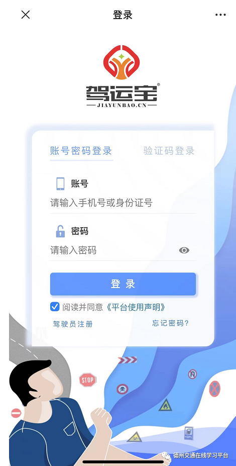 打开驾运宝培训系统,进入登录界面,输入已经注册好的账号、密码点击登录按钮进入培训系统