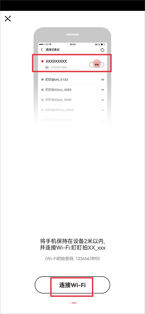 4、设备安装完成后,App会自动搜索记录仪Wi-Fi,然后我们在Wi-Fi列表中选择以盯盯拍为开头的WiFi进行连接(默认密码:1234567890),连接成功后返回app即可正常使用啦。