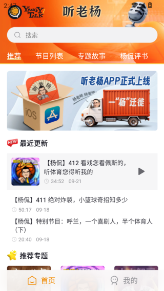 听老杨安卓版官方下载是专为中国体育迷打造的音频平台,由知名体育评论员杨毅主讲,提供专业赛事解说与深度体育分析,平台节目海量且持续更新,支持离线下载、个性化推荐,更有杨侃评书等趣味内容,带你走进体育台前幕后,边听边聊,有趣有料。