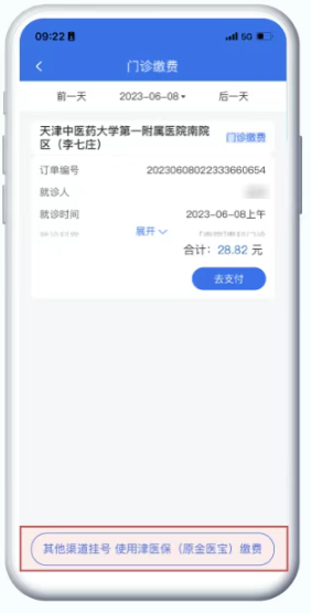 注:如通过其他渠道(院内窗口、小程序或其它App) 挂号,使用津医保缴费,可点击页面下方按钮,选择医院后,查询门诊缴费
