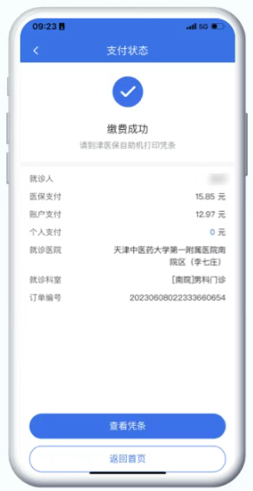 返回津医保,缴费成功。 可点击 【查看凭条] 按钮查看缴费电子凭证。
