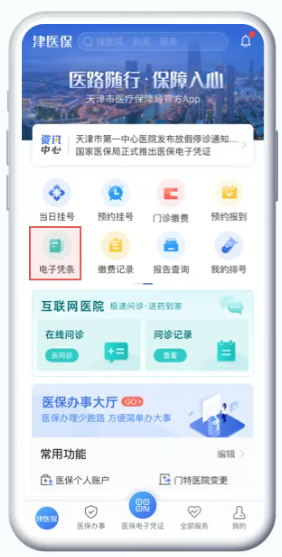 打开津医保App,在首页选择 【电子凭条】 如图: