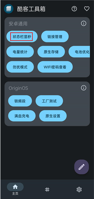 1、打开酷客工具箱App,点击状态栏显秒
