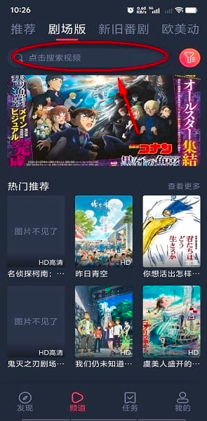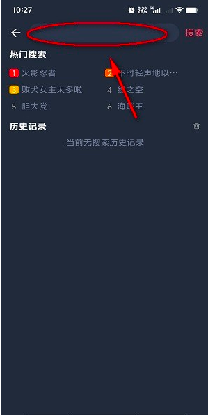 1、打开樱花动漫app后,点击最上面的搜索框,如图所示;
