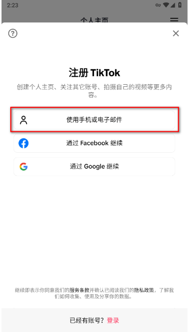 3、如果你有Google账号等,可以直接登录,我这里以手机或者电子邮件为例注册