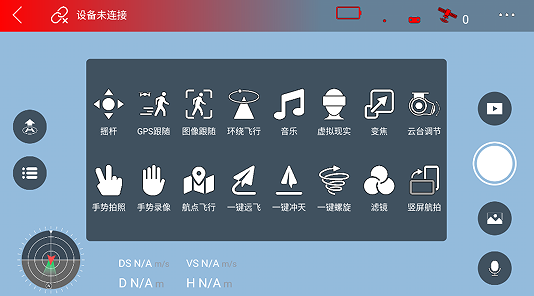 APP具有实时图传、飞行参数设置和航拍等飞行器功能。