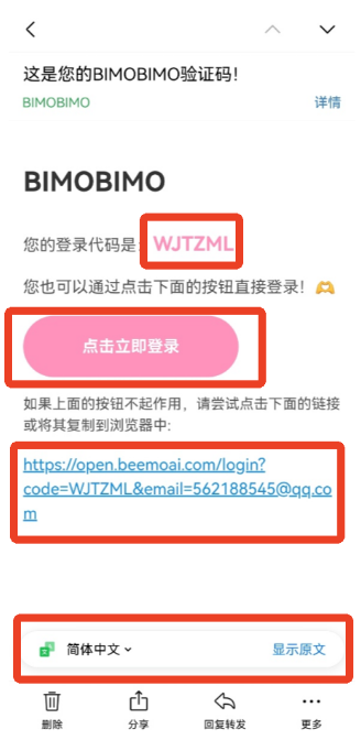 3、之后你的邮箱就会收到官方发送的登录代码,粉色字母就是验证码,下图是自动翻译的结果所以显示的是中文,原文为英文。复制粉色的字母,也可以点击下方粉色的按钮进行登录,又或者通过最下方的链接登录。