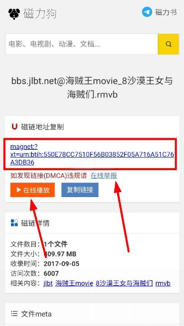 3、用户可以复制磁力链接进行下载,也可以进行在线播放