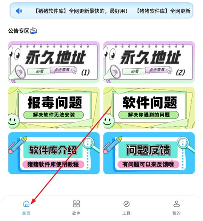 1、猪猪软件库提供了四个板块,首页板块中拥有公告专区,让用户可以查看永久地址,了解软件问题;