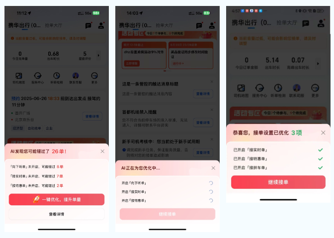 通过空驶时听单检测的自动弹窗能力,帮司机检测可优化的接单相关设置项,并一键操作模式设置,快速打开未听的类型。同时解决司机「不知道自己不知道」的情况,避免司机损失。