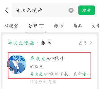 1、在微信中搜索【异次元漫画】,点击【异次元APP软件】公众号。