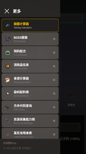 1.打开苏苏方舟盒子APP,点击“更多”菜单,进入功能列表,选择“驯服计算器”以计算生物驯服所需时间与资源。