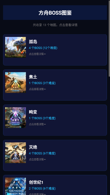 3.返回主菜单,点击“BOSS图鉴”,查看不同地图(如孤岛、焦土、畸变等)的BOSS信息,点击详情可获取刷新位置、难度及战斗技巧。