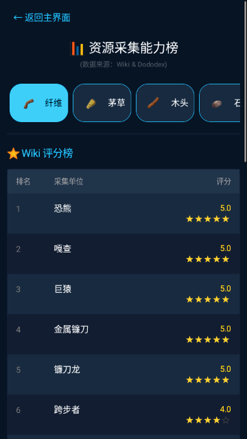 9.查看“资源采集能力榜”,按纤维、茅草、木头等分类,了解各生物(如恐熊、巨猿)的采集效率排名,优化队伍配置。