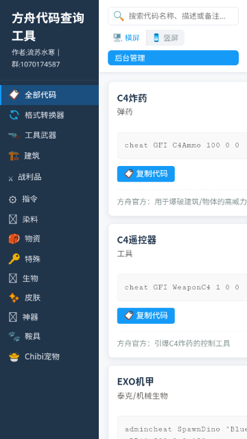 8.点击“方舟代码查询工具”,在搜索栏输入关键词查找控制台指令,如C4作药、遥控器、EXO机甲等,一键复制代码用于游戏内调用。