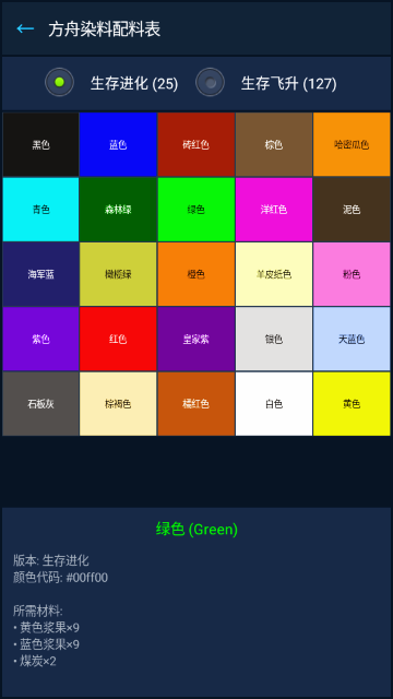7.进入“染料配料表”,选择“生存进化”或“生存飞升”版本,查看各颜色染料所需材料,如绿色需黄色浆果与蓝色浆果组合。
