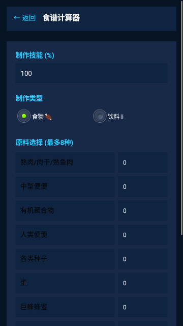 6.使用“食谱计算器”功能,输入制作技能百分比与原料数量,计算可制作的食物或饮料,提升资源利用效率。