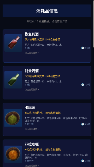 5.点击“消耗品信息”,查阅恢复药酒、能量药酒、卡琳汤等物品的配方、效果与持续时间,便于野外生存时快速准备物资。