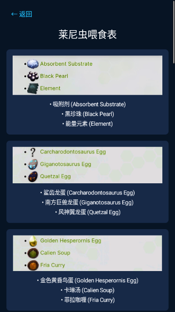 10.最后进入“莱尼虫喂食表”,查看莱尼虫可食用的物品清单,如吸收剂、黑珍珠、元素等,确保合理喂养以获得最佳收益。