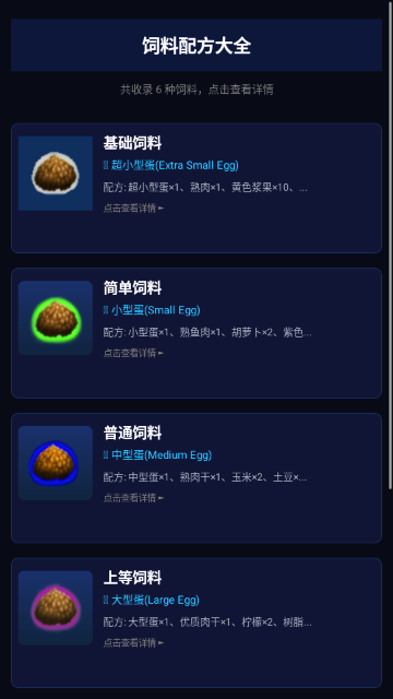 4.进入“饲料配方”页面,浏览基础、普通、上等饲料的制作方法,如超小型蛋、中型蛋、大型蛋等,支持查看详情与复制配方。