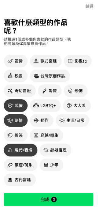 8、选择你喜欢的漫画类型,支持多选,选择完之后点击下方【完成】,也可点击右上角跳过。