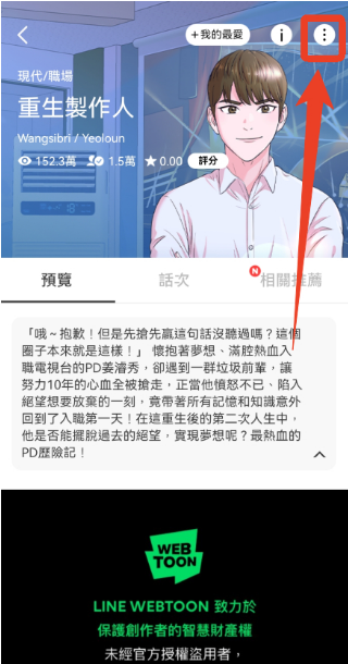 1、进入漫画详情页面后,点击右上方【三个点】。