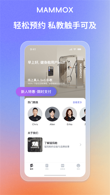 猛犸舱健身最新版是一款身服务平台,提供真人私教一对一在线指导,支持与健身设备绑定,教练可根据你的情况实时调整重量。实时沟通,获得专业训练指导,在家也能享受定制化健身体验。你的专属健身助手,科学锻炼更高效!
