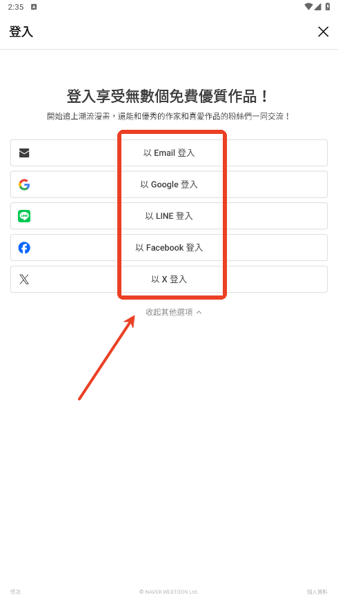 1、进入软件,你可以通过多种渠道注册登录。如果你没有快捷登录账户,可以点击邮箱注册。