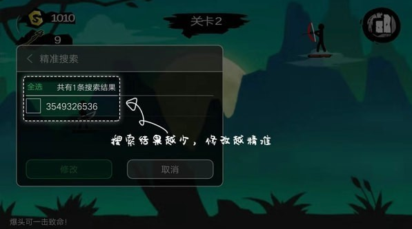 1、精准搜索:启动游戏后,确定想修改的游戏数值(比如游戏A,当前金币为1000),点击“悬浮框-精准搜索”,输入数值“1000”,点击搜索按钮,如搜索结果不为0,请点击“返回游戏”,体验游戏使金币发生变化,比如变为1010,接着重新点击悬浮框,将数值“1010”输入,系统会检索前后发生变化的数据,如搜索结果不为O,您可以点击“查看”,针对数据进行修改,或者重复返回游戏让金币变化后再搜索结果更加精准哦。