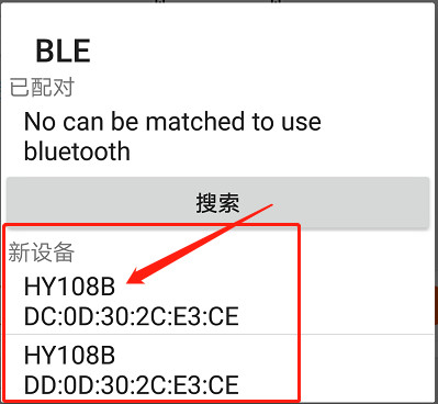 第三步:点击“搜索”,在出现的窗口中选择“HY108B”,一般情况下会出现2个相同的打印机,默认选第一个进行连接。