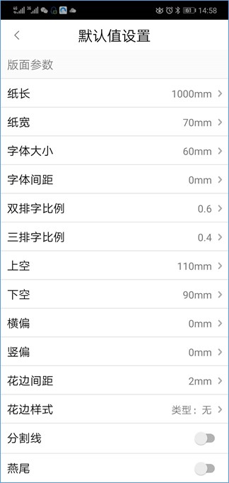 版面部分可进行打印长度,宽度,文字大小,比例,上空下空,左偏右偏,横偏竖偏,花边燕尾等进行设置;