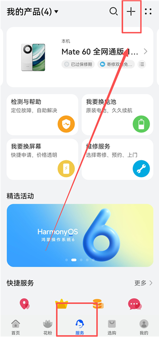 1、进入我的华为App,进入【服务】界面,点击上方的【+】图标。