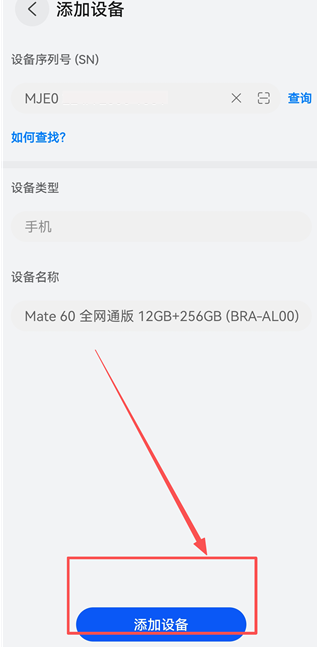 3、若条形码不在身边,我们可以选择【手动输入】的方式添加,打开需要绑定的手机的设备详情界面,找到序列号。