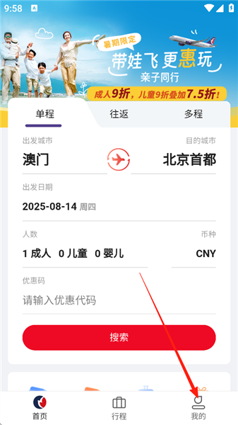 打开澳门航空app,进入后根据需求选择单程,往返,多程,选择出发城市,目的城市,出发日期,人数等信息,点击搜索