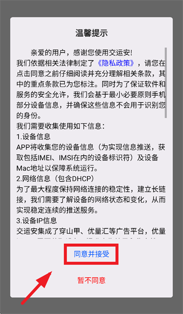 打开交运安app,在温馨提示界面点击同意并接受