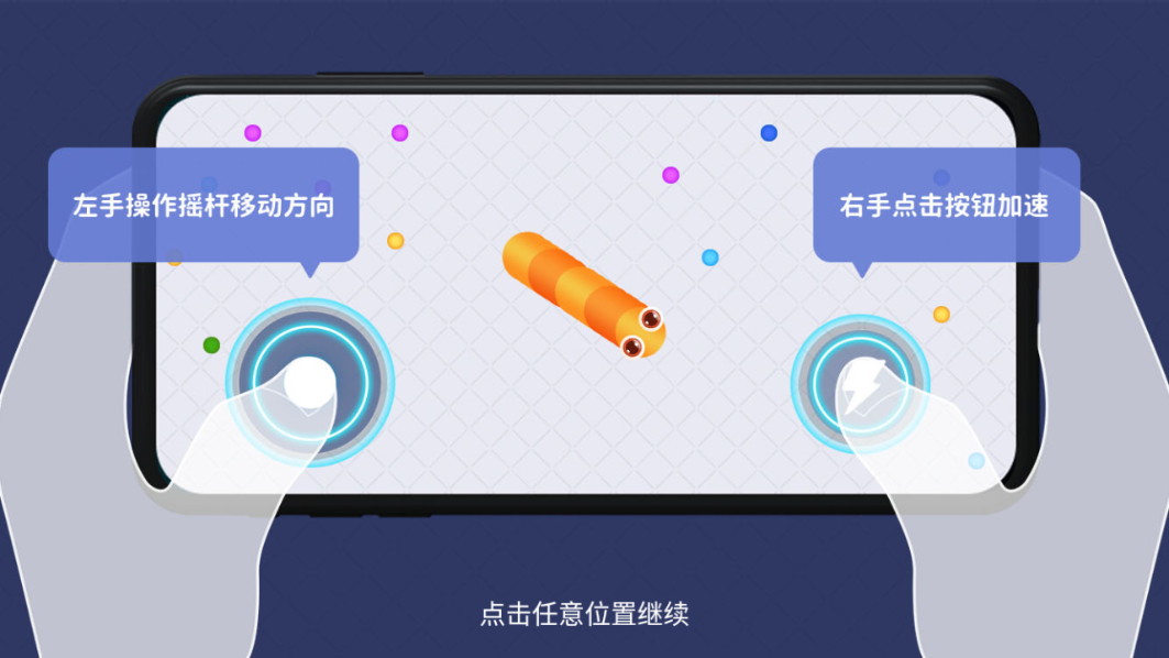2、然后就会进入一段游戏教程,可以帮助玩家更好地熟悉游戏玩法;左边的按钮控制蛇移动的方向,而右边则是加速;