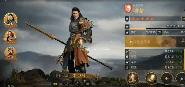 至于技能方面,之所以叫做反击枪因为大多数技能是被动技能或者指挥技能。例如项羽适合带反戈一击,普攻可反击并且每秒增加武力值,适合反击流长时间战斗将伤害叠起来。然后是带风卷残云,每3秒增加武力伤害,可叠10层。