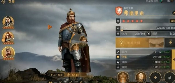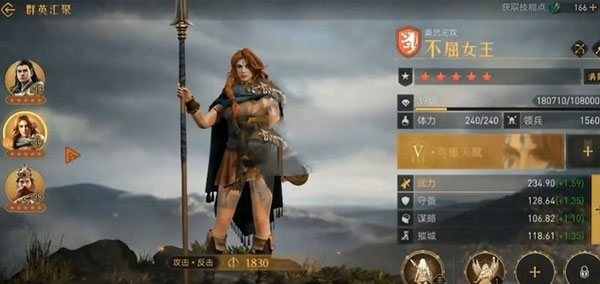 反击枪的核心主将是项羽,第二个人物则是不屈女王,最后补一手弗德里希。这三位都是枪兵种,放一起战斗风格上都是有加成的,通过天赋还有双倍的提升。