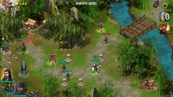 游戏延续策马三国写实风格的经典英雄人物和游戏场景,目前前五个大章节总计50个精心设计的剧情关卡,出场20多位脍炙人口的三国英豪,带您踏入汉末乱世,让人耳目一新的体验全新的热血三国塔防游戏。
