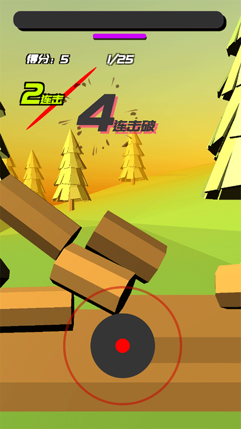 2、注意障碍:游戏中还会布置一些障碍,几个小圆球会掺杂在木桩之中,砍刀就会导致游戏结束,一定要留意。