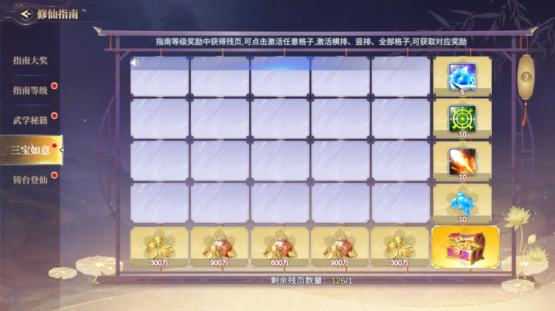 6、通过三宝如意残页激活格子,连线后可领取额外奖励。激活所有格子还能获得特殊大奖。领取当前奖励后页面将自动刷新,可继续使用残页激活新格子;