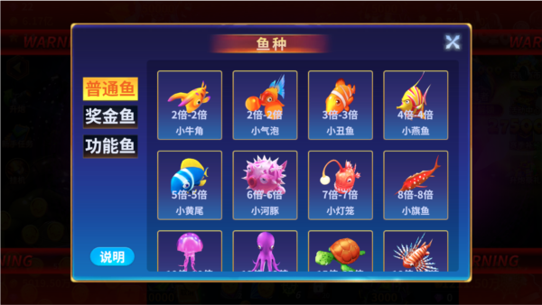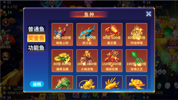 奖金鱼:鲶鱼上校、武士鲨、霸王蟹等等。分值可达几百上千分。深海之王被击中倍率最高900倍。