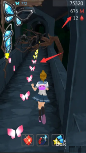 进入游戏,开始进行跑酷关卡,过程中尽量多地获得蝴蝶,提高通关的评分,获得更多的金币。