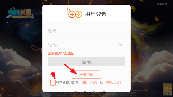 1、在本站下载游戏后打开游戏,点击账号登录,勾选用户协议和隐私政策