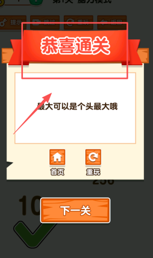 3、看通关成功页,点下方橙色下一关按钮,或点首页回主页,选重玩再做一遍。
