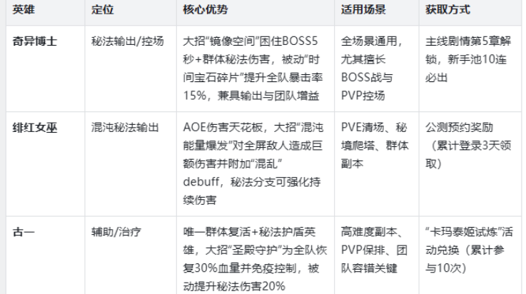 奇异女孩:辅助型法师,提升全队回蓝速度,适合秘法技能消耗高的阵容,但治疗能力较弱,需搭配古一使用。