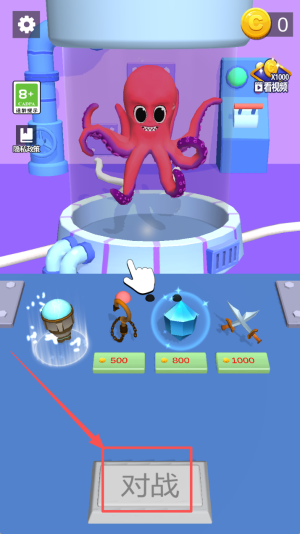 1、先看看画面里的章鱼和水池,点一下最下面那个灰色的对战按钮开始游戏。