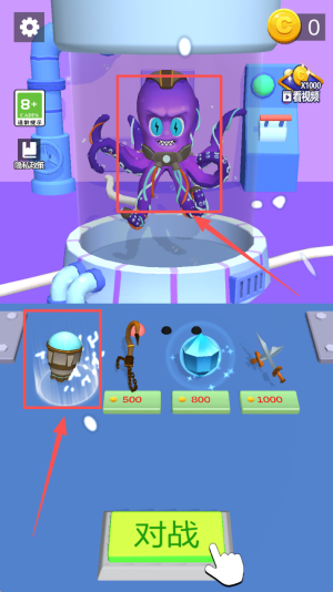 2、在紫色章鱼这个画面,点一下标价500金币的炸弹图标,再按绿色对战按钮准备开始。