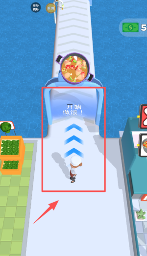 4、点蓝框开始做饭,用紫红锅里美食,拿左侧蔬菜,赚绿色美元符号5元。