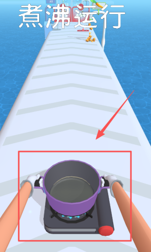1、看跑酷画面,点红箭头指的紫锅,控制戴手套角色捧着锅在长道上跑,收集黄色食物道具。